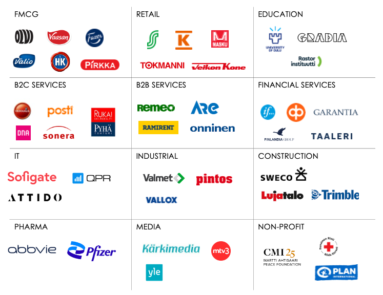 Markkinointitoimistoissa saa hienon tilaisuuden tutustua eri yrityksiin ja toimialoihin. Itse olen 42 vuoden aikana tehnyt töitä yli 200 asiakasorganisaation kanssa, joista muutamia esimerkkejä kuvassa. Yhdenkään liiketoimintaa en tietenkään tunne niin hyvin kuin he itse.